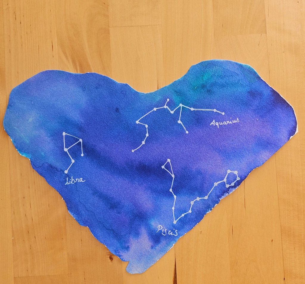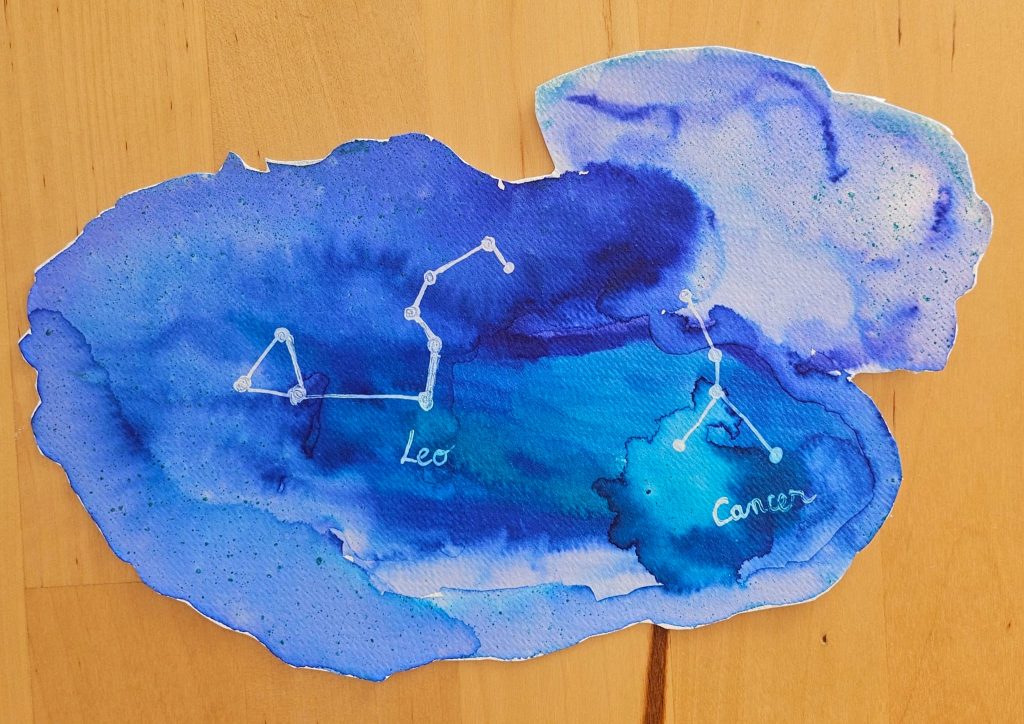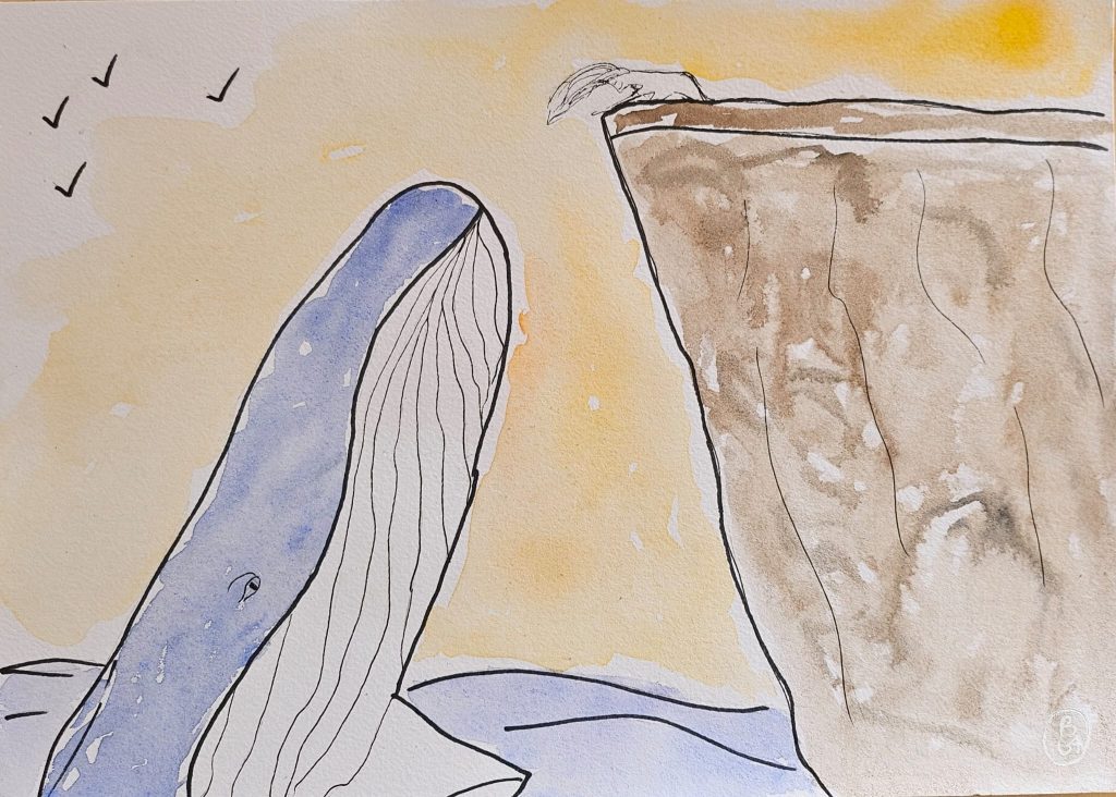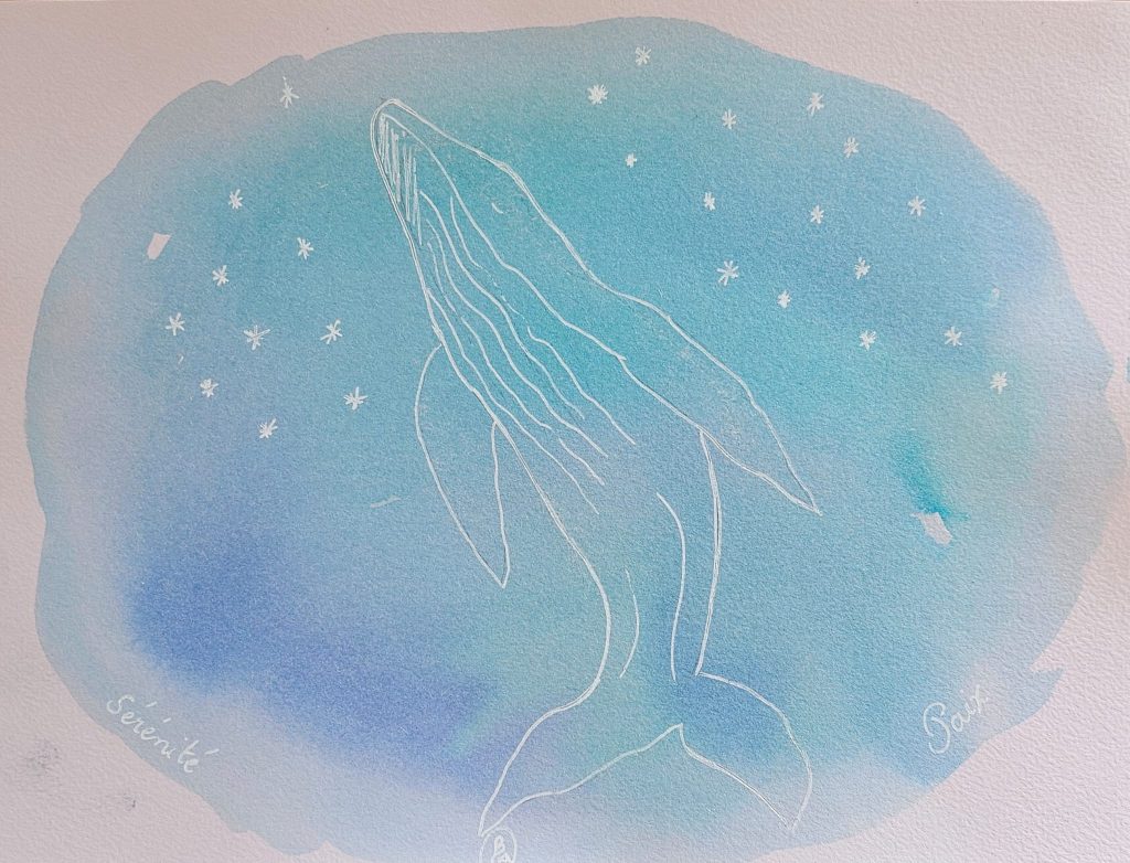 Baleine étoiles, fond aquarelle, dessin au feutre blanc, format A4, Papier 300g/m2